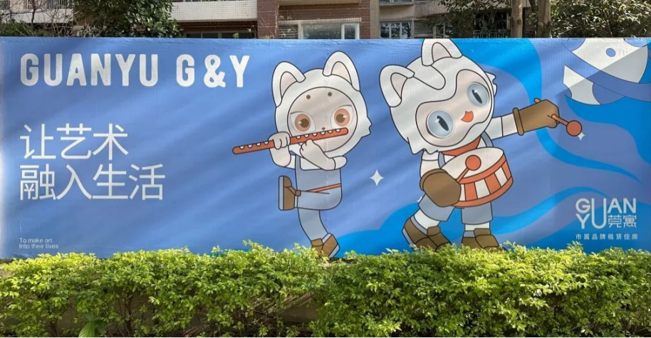 两只可爱潮萌“小莞”“小寓”IP形象“爬”上了小区的道路间、宣传栏上,像家人一样静静地陪伴着这里的租户。