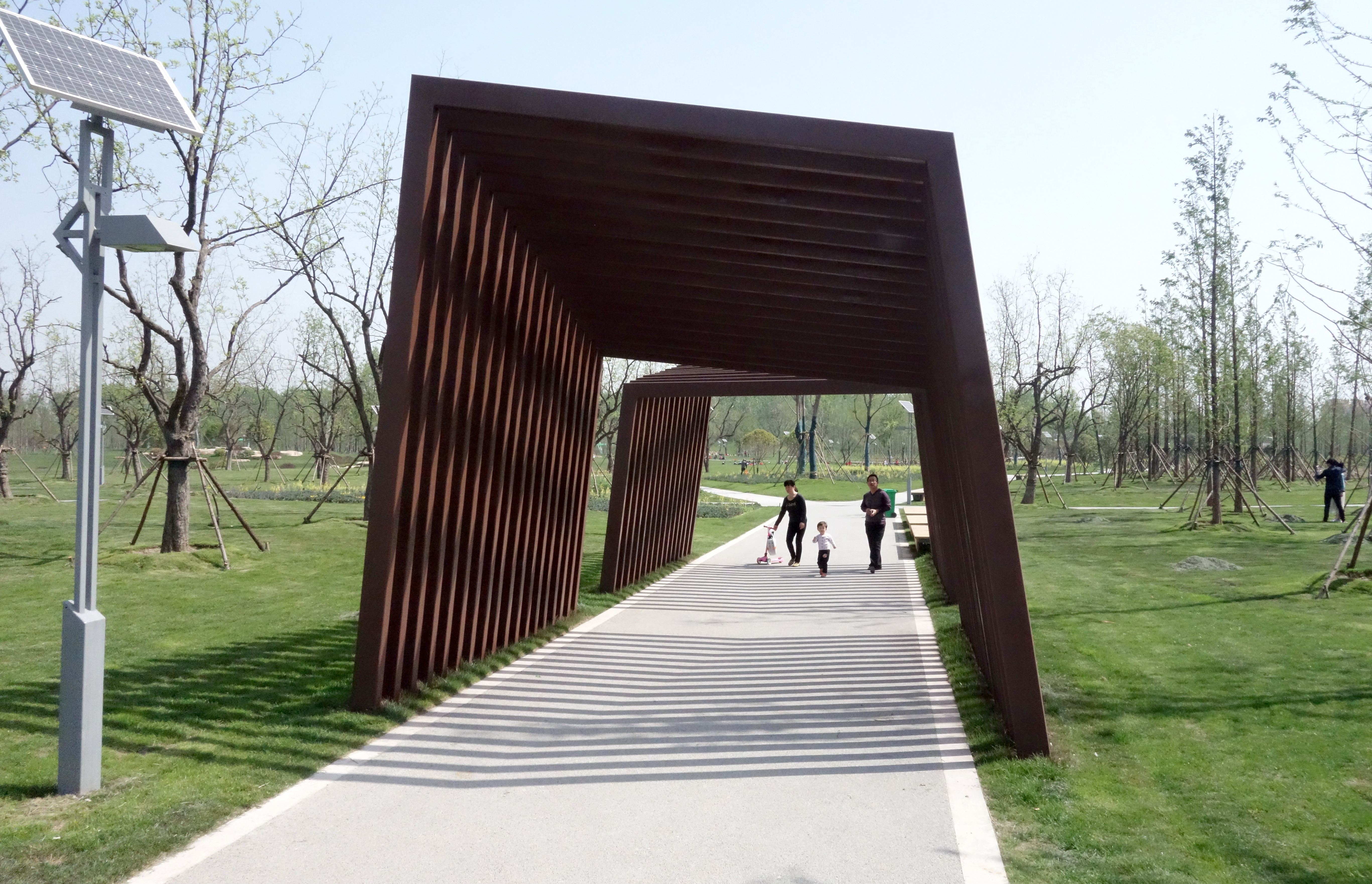 从北三环颍河桥沿颍右堤一路向北,风景与南侧迥异,桥下是成片的水杉,一条观光路延伸到颍河边。在绿化植物选择上,承建方东方园林保留了柳树、榆树、杨树、国槐等原生乔木,添置广玉兰、香樟、朴树等景观苗木,狼尾草、狗牙根等适应性强的地被植物也被广泛种植,一派乡野风光。
