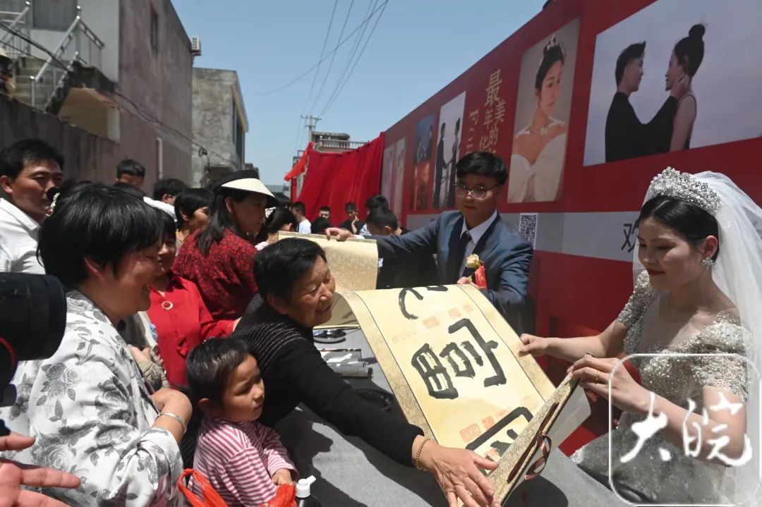 新郎方明辉说,他和新娘刘金卫相恋多年,深知高彩礼给农村家庭带来的沉重负担。两人商量举办婚礼时,刘金卫主动表示不要彩礼,希望方明辉及其朋友能为振兴乡村manbetx安卓手机 做点贡献,婚礼当天向前来贺喜的亲友赠送书法作品。