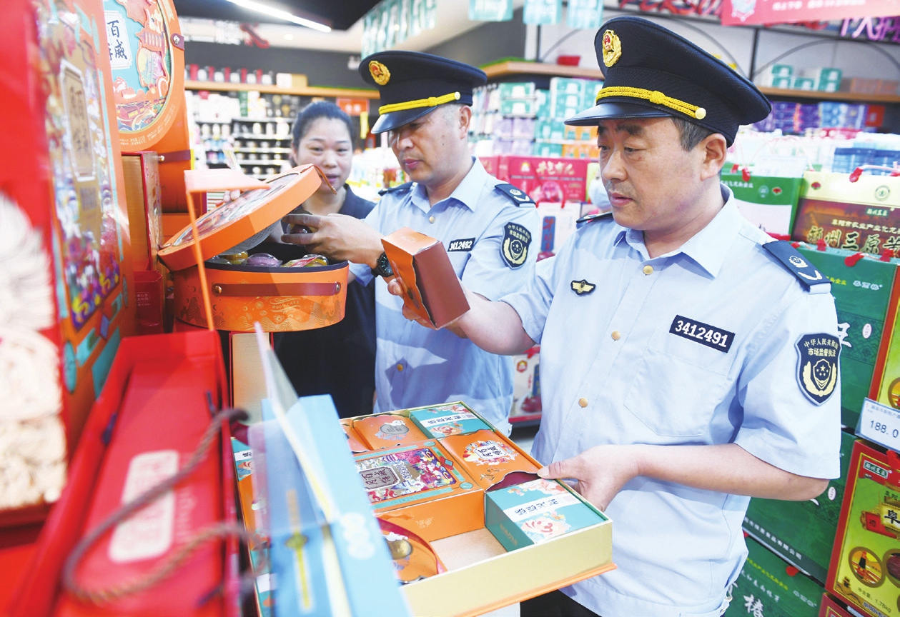 中秋佳节临近,颍州区市场监管局以大中型商超、农贸市场和商店为重点,开展月饼等食品的监督检查,严厉打击销售过期食品和“三无”月饼等行为,保障节日食品市场消费安全。图为8月30日,鼓楼市场监管所执法人员在人民路一家超市内对在售月饼进行检查。(记者 王彪 摄)