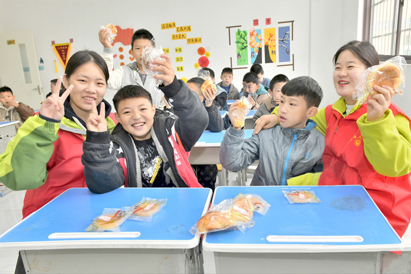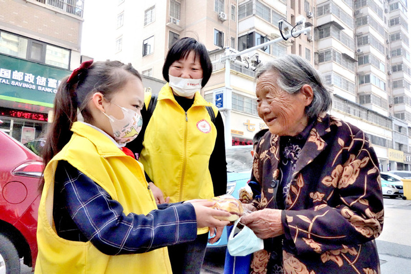 颍东区东盛路小学的学生为老人赠送爱心面包