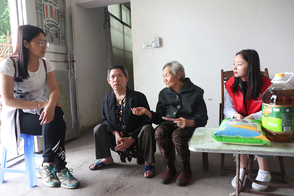 5月15日,四川省广安市广安区总工会干部正在方坪乡磨盘村走访贫困残疾户张忠菊,与其交心谈心,为其发放500元慰问金和物资,以献爱心的方式迎接5月19日第29次全国助残日的到来。