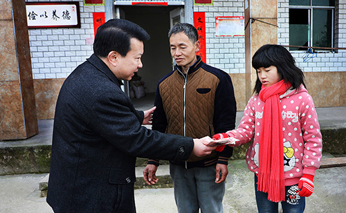 1月11日,华蓥市政协与四川华晶电子有限公司爱心人士,冒着严寒深入禄市镇大坡老村结对建卡贫困户邹云丰家中,为他们家送去助学帮扶资金5000元,践行“百企帮百村”活动。