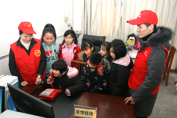 在活动室,志愿者们帮助留守儿童拨通了亲切电话,同学们在电话里向在外辛劳的父母们汇报着自己的学习生活情况。