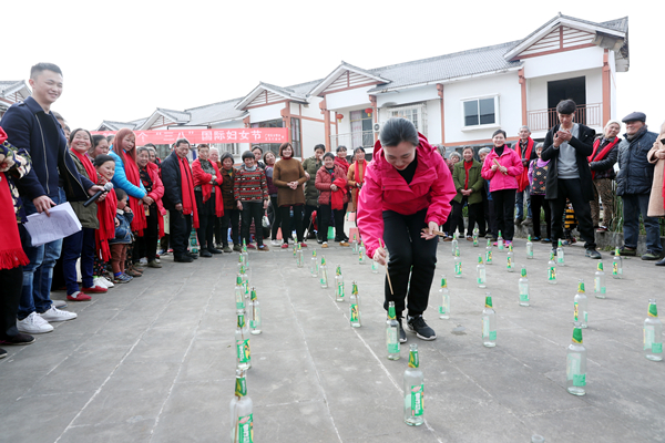 3月5日下午,四川省广安市广安区肖溪镇菱角村易地扶贫搬迁集中安置点,该村农家女正在参加“插秧”比赛,通过趣味运动方式庆祝109个“三八”国际妇女节。