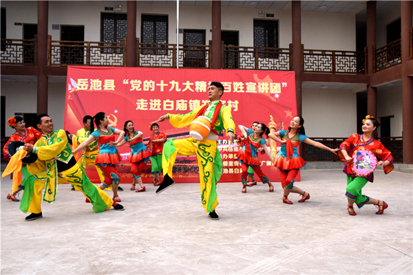 近日,由中共广安市岳池县委、岳池县人民政府主办,县委宣传部、县文广新局、县文联承办的党的“十九大百姓精神宣讲团”纷纷走进贫困村,用舞蹈、音乐快板、车灯等百姓喜闻乐见的方式宣传党的十九大精神、宣讲脱贫攻坚政策,让百姓对十九大精神、脱贫政策入脑入心。(张凯 文/图)