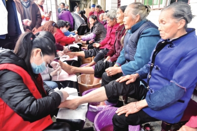 10月13日,在重阳节来临之际,邻水县组织50多名志愿者,前往梁板乡高龙村看望孤寡老人,为300多位老人理发、洗脚、修指甲,陪他们聊天,送去节日的问候与祝福。