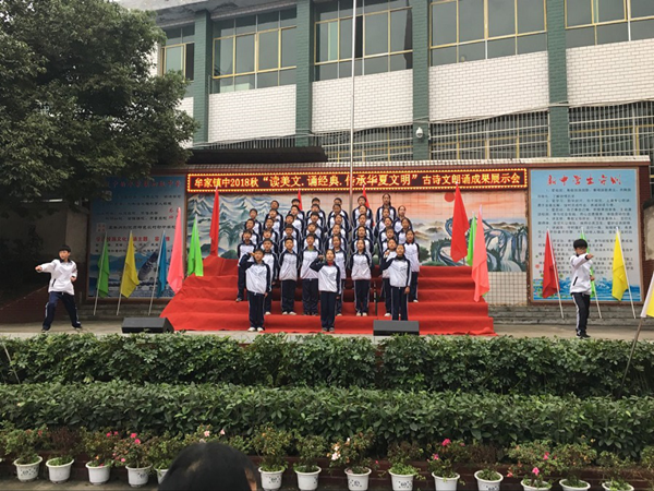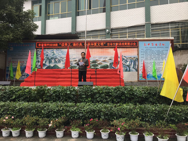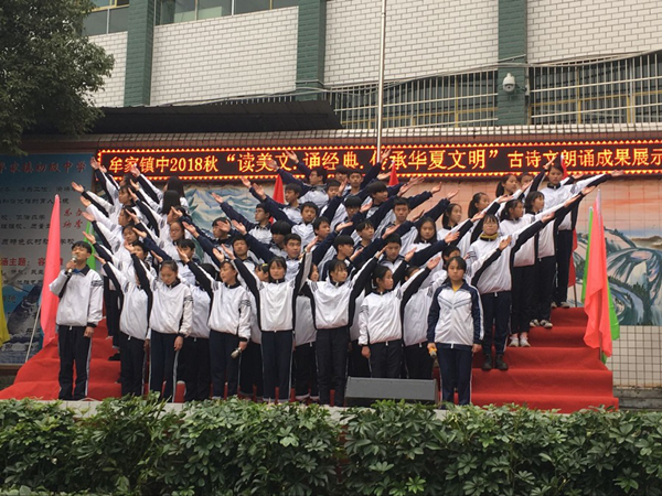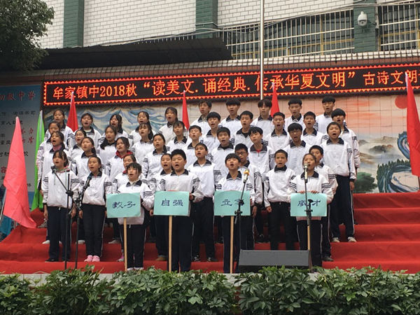 为增强学生对中国传统manbetx安卓手机 的了解,激发学生对古诗文的兴趣,邻水县牟家镇中于2018春开展了“古诗文经典诵读”活动。近一年来,师生们全员参与,以“晨读、午诵、暮省”方式全情投入,用经典诗文深厚的内涵,独特的魅力,似春雨般无声地滋润师生们的心灵。12月11日下午,学校举办了以“读美文,诵经典,传承华夏文明”为主题的古诗文朗诵成果展示活动,全校师生近一千人全员参与活动。
