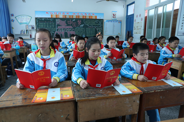 2018年12月12日,四川省广安市广安区长乐小学,学生正在进行《宪法》阅读活动。