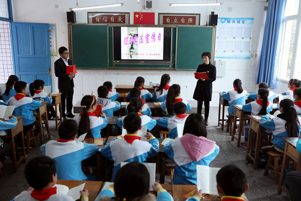 2018年12月12日,四川省广安市广安区长乐小学六年级一班教室,公证员正在向学生解读《宪法》。