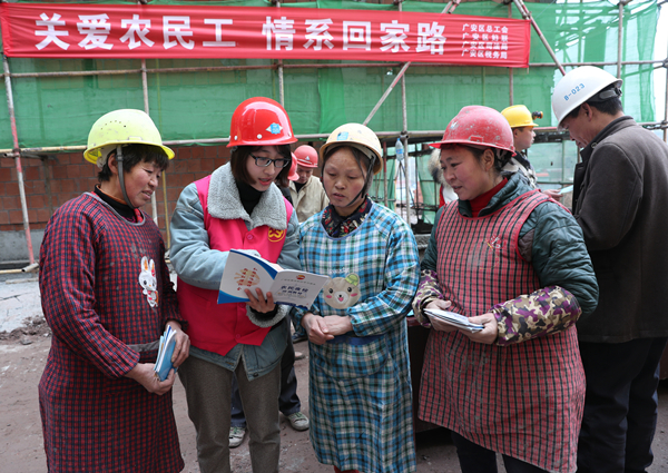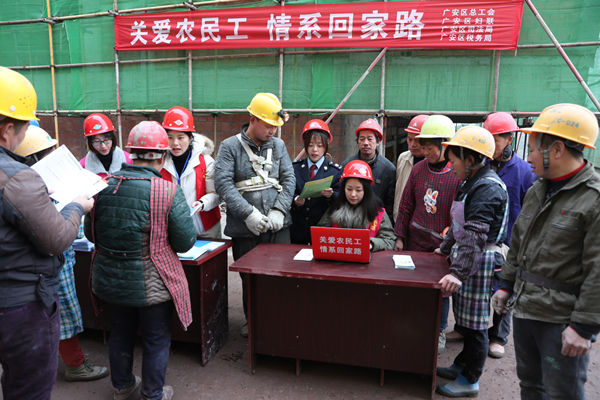 当日,四川省广安市广安区总工会、妇联、司法局、税务局党团员志愿者组成“关爱农民工 情暖回家路”志愿服务小分队来到农民工较多的该区中桥街道中建五局三公司广安承平盛世项目建设工地、环宇林肯广场等建筑工地,在义务帮助农民工预定回家、返程火车票的同时,向农民工发放禁毒、防艾、农民工维权、个人所得税附加扣除暂行办法等法律法规,让农民工怀揣法律利剑闯天下。