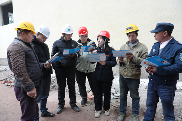 1月2日,四川省广安市广安区党员志愿者正在中建五局三公司广安承平盛世项目建设工地向农民工宣传法律法规和帮助农民工预定火车票,关爱农民工,情暖回家路。