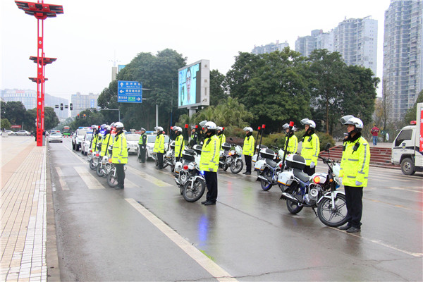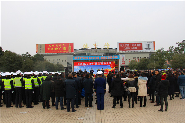 为认真做好2019年春运道路交通安全管理工作,有效预防和减少道路交通事故,营造安全畅通、和谐文明的春运道路交通环境,1月21日上午,岳池县2019年春运启动仪式在陆游广场举行。岳池县委常委、副县长刘俊,副县长、公安局长罗诚,交警支队副支队长陈汉华,县公安局机关党委书记熊虎出席启动仪式,乡镇交管办、党政机关、运输企业、群众代表及交警大队、派出所交管中队一线执法人员共300余人参加仪式。启动仪式由副县长、公安局长罗诚主持。
