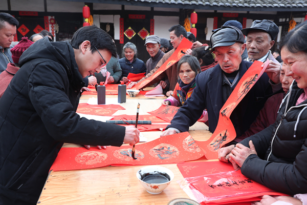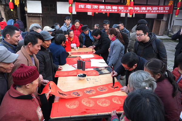 1月21日,四川省广安区纪委监委、总工会、妇联邀请的2名书法家正在为2018年脱贫摘帽村、广安区兴平镇文明村民和贫困户免费书写“廉洁春联”,让该村的春节有了浓浓的“廉”味。