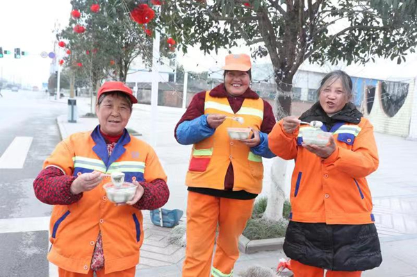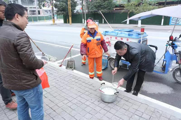 2月19日中午,四川省广安经开区环卫园林所党员志愿者正在向坚守岗位的环卫工赠送亲手烹制的爱心汤圆,让不能回家过元宵节的环卫工感受别样的温情。