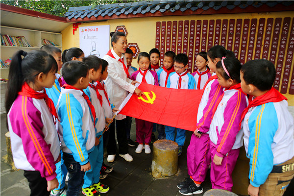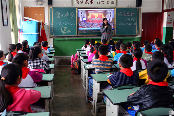 10月23日,在广安市广安区北仓路小学五年级一班教室,该班教师正在向学生普及党的十九大相关知识,进行党史教育,引领学生从小爱党敬党快乐成长。