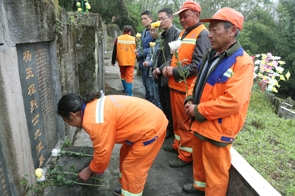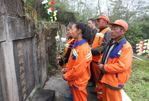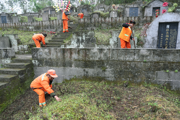 4月2日,四川省广安经开区园林环卫工人正在清除奎阁烈士陵园垃圾和杂草,以方便市民和学生前来缅怀祭拜先烈。