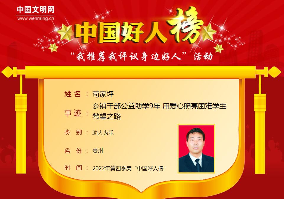 2013年,苟家坪到村小支教,了解当地困难情况,便开启了自己的公益助学之路。多年来,在苟家坪的带动下,200余名教师成为志愿者,1000余名社会各界爱心人士参与捐资助学,一对一资助贫困学生1000余人,累计发放助学金350余万元、帮扶物资达200余万元。苟家坪获得贵州省“优秀春晖使者”等荣誉。