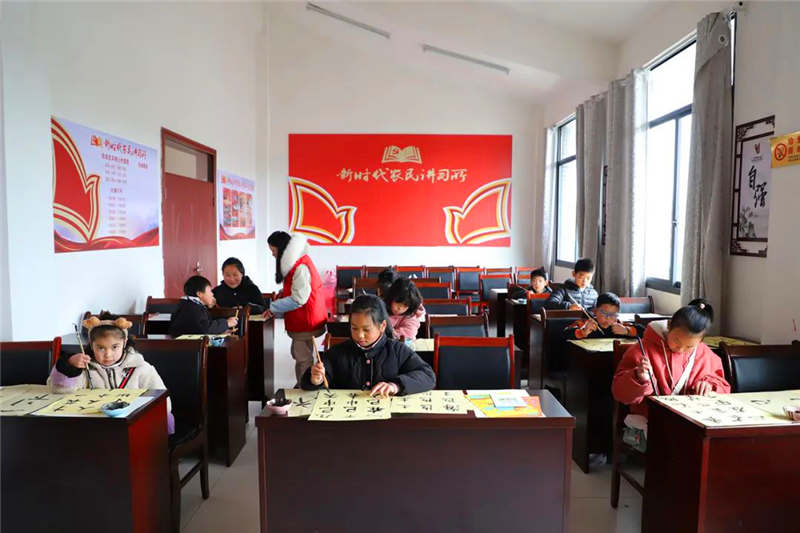 安顺市西秀区杨武乡志愿者为孩子们上书法课。图片来源:西秀区创建办