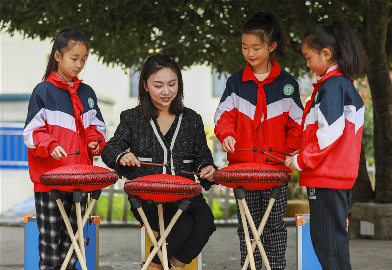 黔西市甘棠镇甘棠小学老师给学生示范打空灵鼓
