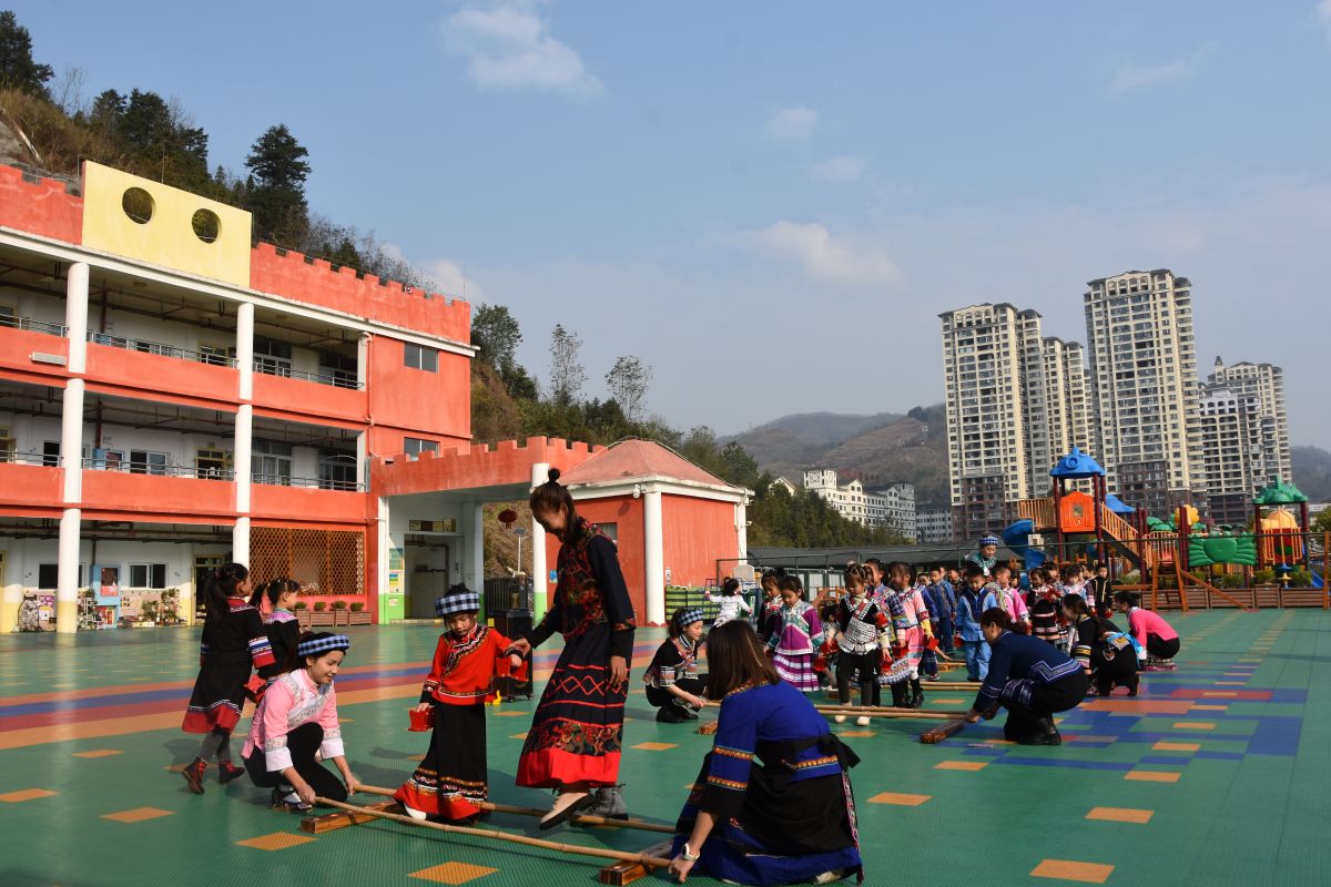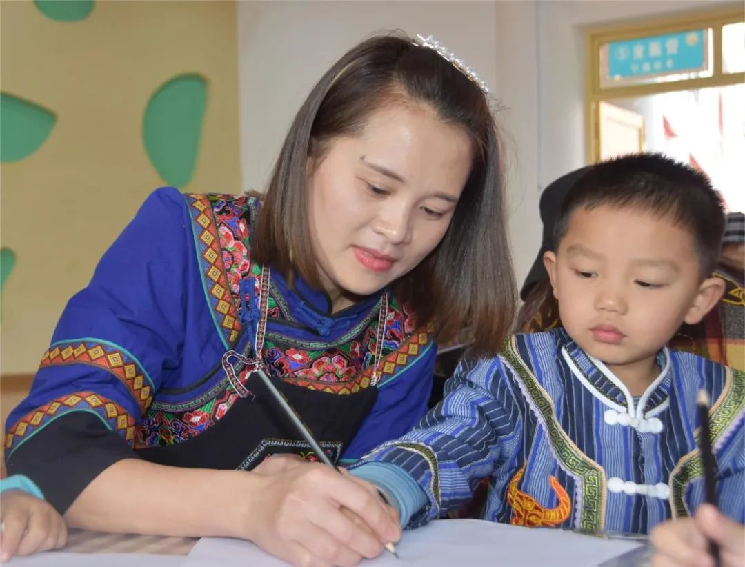 活动中,小朋友和老师们身着民族服装,通过大手牵小手的形式,共同跳起板凳舞、圆圈舞、竹竿舞等民族舞蹈,让孩子们亲身参与布依族扎染、绘画背带花等传统民族工艺。