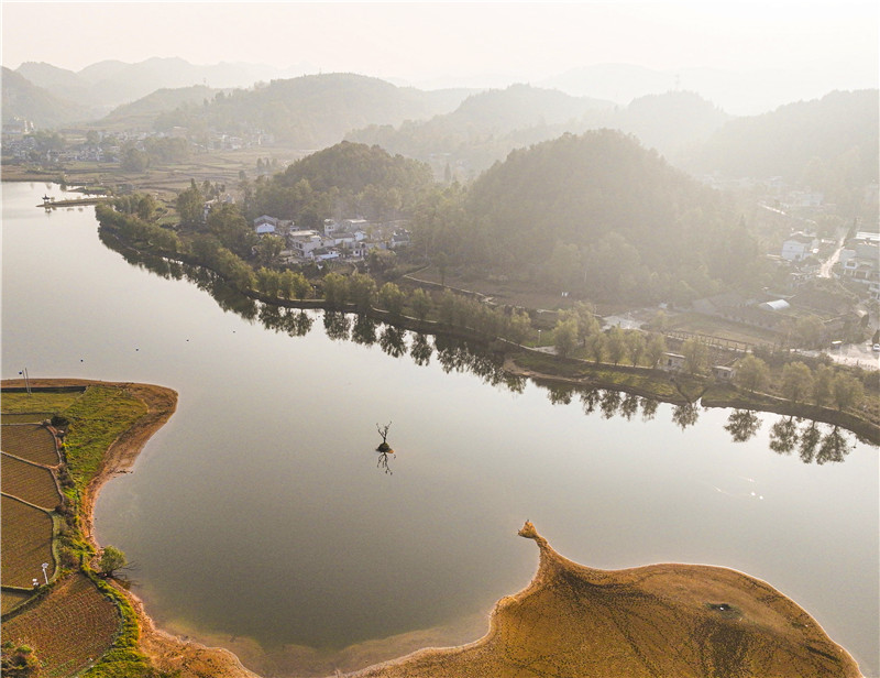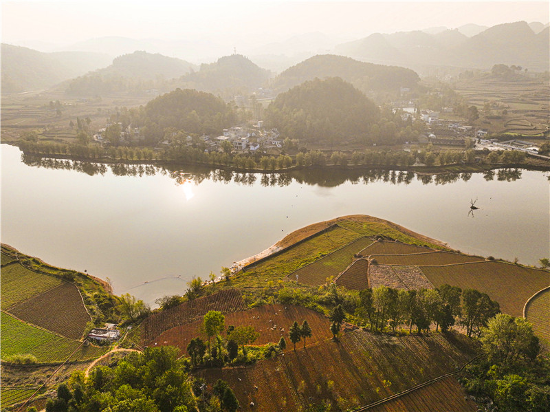 2022年11月7日,航拍贵州省黔西市绿化白族彝族乡大海子村明镜的湖水、错落有致的民居,和远山的白雾构成一幅乡村振兴田园风光美画卷。