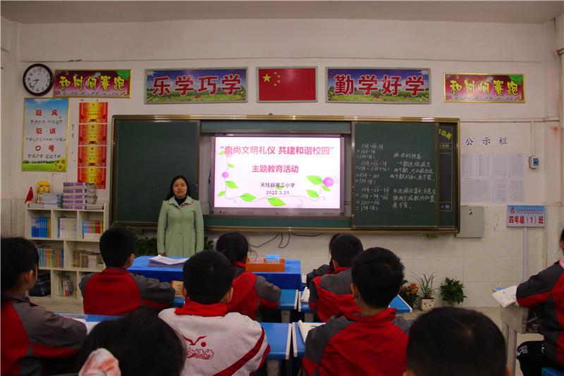 活动中,分管德育工作的副校长乐小英从“程门立雪”和“让一让,六尺巷”两个传统美德故事讲起,让同学们知道中国是一个有着五千年历史的文明古国,中华民族素来是一个温文尔雅,落落大方,见义勇为,谦恭礼让的文明礼仪之邦。接着,通过图片展示、播放视频、学唱“文明礼仪”歌、解读《天柱三小学生一日常规》等形式,分别从“教室文明、与人文明、语言文明、形象文明、餐饮文明、生态文明”等方面引导学生如何规范自身言行,帮助学生树立正确的认知观,使同学们进一步认识到文明礼仪在生活中的重要性。倡导同学们从自己做起、从现在做起,从小养成讲文明、懂礼貌、守秩序、有公德的良好习惯,共创共建“人人有礼貌、个个懂礼仪、处处讲文明”的和谐校园。