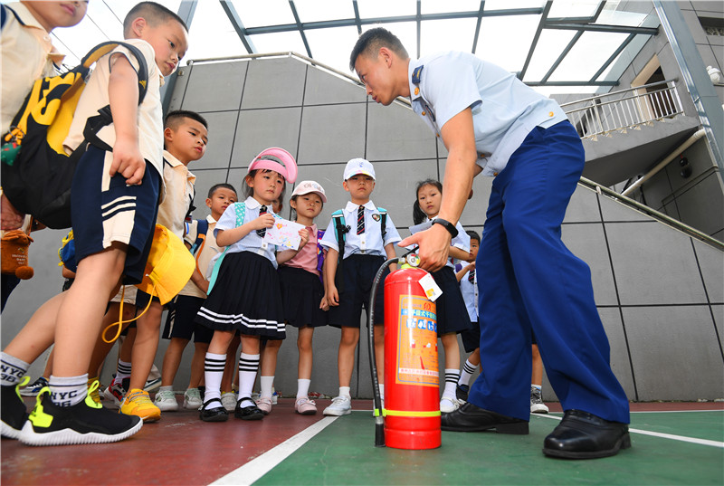 小朋友们学习遇到火灾时如何正确使用灭火器