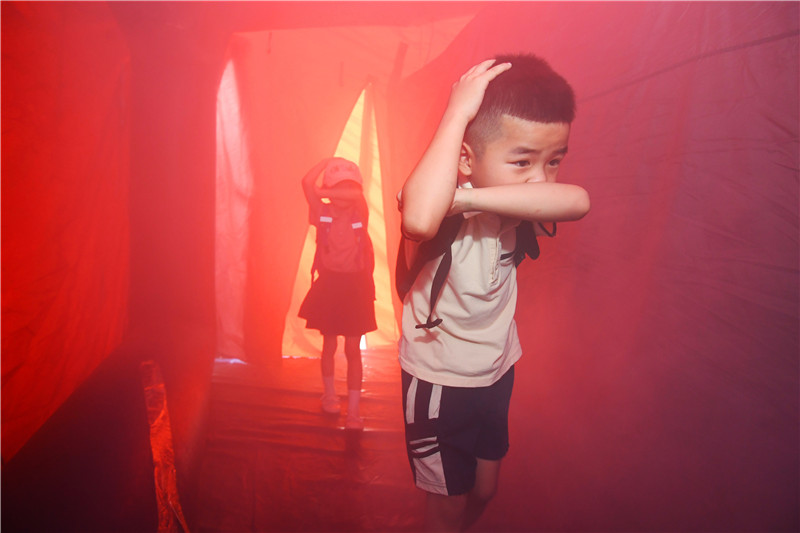 小朋友们体验模拟逃生帐篷,学习遇到火灾时该如何逃生