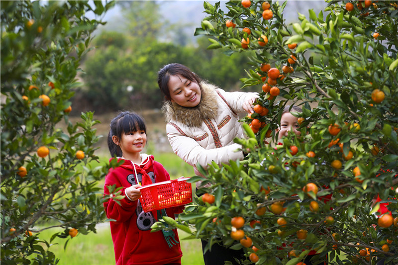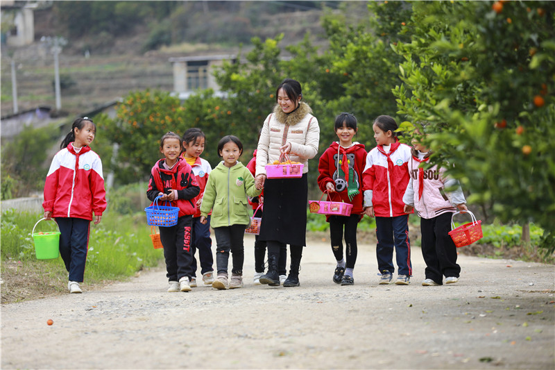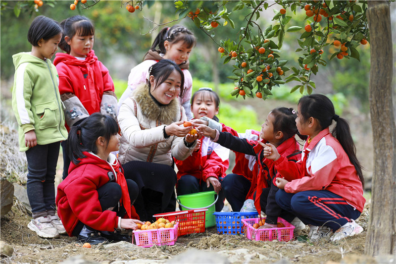 11月15日,黔西市素朴镇素丰小学校园农场橘子成熟,老师带领学生体验丰收的喜悦。