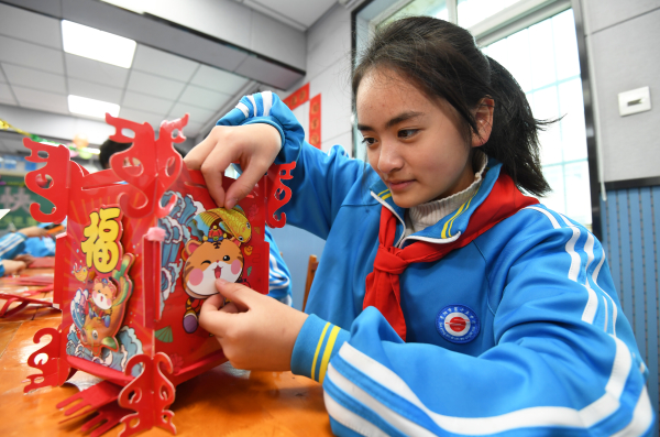 12月31日,贵阳市南明区部分中小学校开展丰富多彩的迎新年主题活动,学生们通过包饺子、绘制传统木版年画、制作灯笼、贴窗花等形式,迎接2022虎年的到来。(赵松)