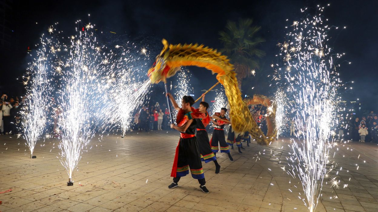 在民间绝活打铁花表演中,打铁花艺人将烧熔后达到1600度的铁汁轻轻抛起,燃烧着的铁汁在瞬间洒上夜空,宛如烟花一般绚烂夺目,如梦似幻,现代烟花的灿烂夺目和传统绝技的神秘、惊险交织在一起,为前来观赏的群众带来了惊险刺激的感受和视觉上的震撼。