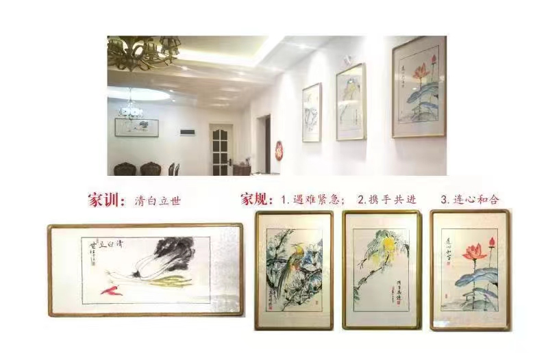 家住乌当区安科拉小镇的申立强家客厅墙上,挂着《白菜图》《玉兰锦鸡》《佛手图》《莲花图》四幅国画。“这四幅画代表着清白立世、携手共进、连心和合等家规家训。把家规和家训以书画形式上墙,是我们一家通过讨论最终确定的。”申立强说。