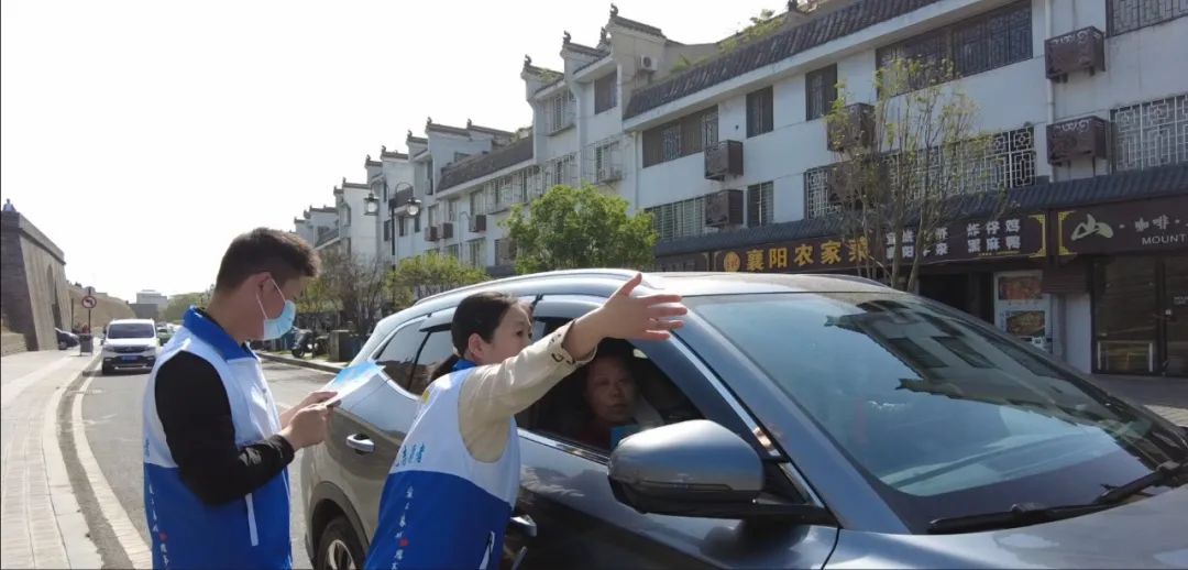 5月2日上午,记者在襄阳小北门看到,身穿蓝色七色花马甲的志愿者正在引导游客规范秩序停车。