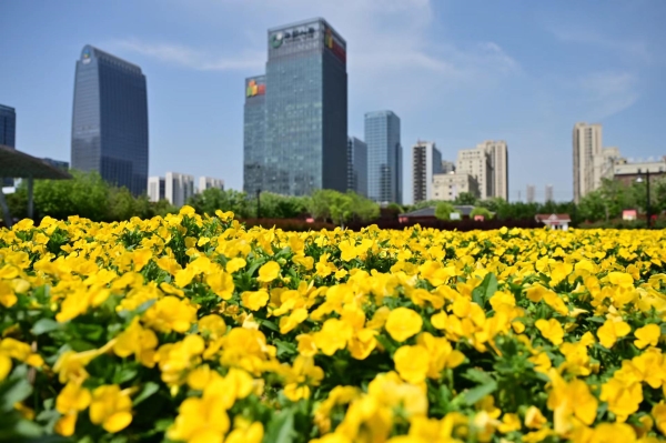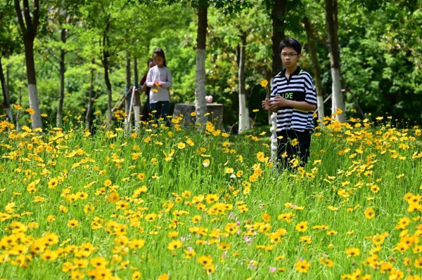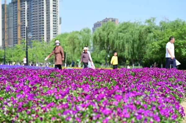初夏时节的市区公园街角,繁花绽放,绿树弄影,处处是生机勃勃的景象。(驻马店文明网)