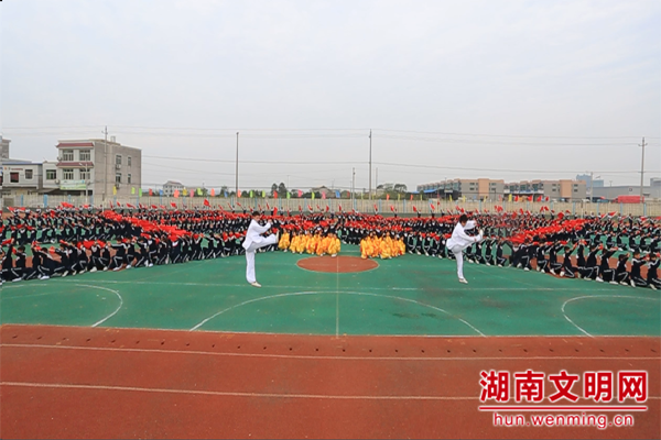 接下来第二环节是全国第一套小学生武术操《旭日东升》,孩子们做起来干劲有力,虎虎生风,动作整齐划一。