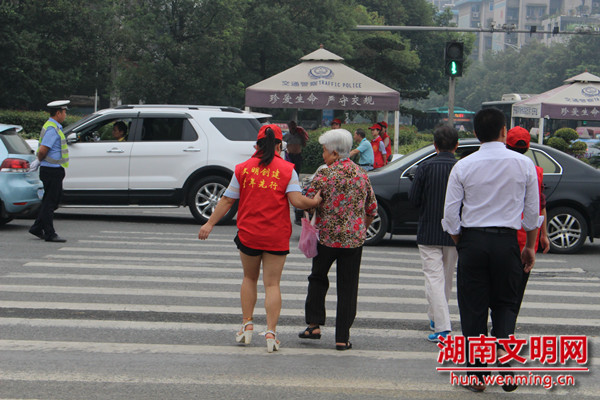 “您好,现在是红灯,请稍后再过马路”!志愿者对行人礼貌劝导,引导市民遵守交通规则,制止闯红灯等不文明行为。并向他们耐心讲解交通安全知识,协助行动不便的老幼病残等特殊人群安全过马路。
