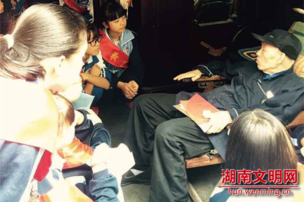在抗战老兵田德恩爷爷家,大家围成一圈,缠着田爷爷将打日本鬼子的故事;田爷爷讲述了他所经历的宜昌战役,低沉而沧桑的声音把大家拉回了那个生死存亡的战争年代,血与火的战场,日本鬼子的残忍、国军将士的英勇无畏让孩子们几度落泪;田爷爷感慨地说道,现今生活得来不容易,并鼓励大家要好好学习,珍爱和平。在老兵彭彩贵爷爷家,他则给同学们讲述了当年监控从台湾突袭大陆日机时的艰险,科技国力的落后,让同学们心中响起“落后就要挨打”的警音。孩子们为彭爷爷唱起了《没有共产党就没有新中国》、《游击队歌》等红色歌曲,回想起当时战斗的热情,也彭爷爷不由一起歌唱起来,那歌声在空中久久飘扬。