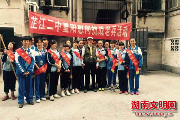 据悉,芷江县教育局在重阳节前夕要求各学校把关爱的目光投向空巢、孤寡、失独老人,积极开展重阳敬老孝老活动。今年又是中国人民抗日战争暨世界反法西斯战争胜利70周年,不少学校将目光聚焦在抗战老兵身上,通过开展听抗战老兵讲抗战故事,与抗战老兵合影,帮助抗战老兵打扫家庭卫生,给抗战老兵送上一份慰问品等慰问活动,开展爱国、敬老综合教育。让同学们进一步了解了历史,珍爱和平,努力报效祖国!也让老人收获一份热闹、一份关爱、一份温暖。