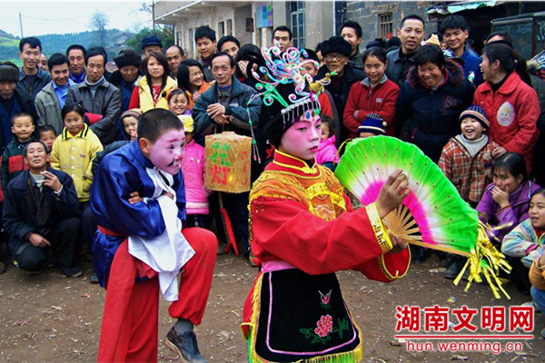 湖南文明网12月28日讯(通讯员 佚名)“一送财喜千呀百子孙,二送富贵两呀双全,哎呀哎子喂……”傍晚时,在麻阳苗族自治县高村镇大塘村,“灯姑娘”身穿花衣,腰系彩带和长裙,手中的彩扇舞得欢快,“赖花子”鼻梁上涂有小团白粉,蹲成“矮马桩”,走起“蛤蟆步”,动作滑稽,逗得围观村民哈哈大笑,拍手叫好。