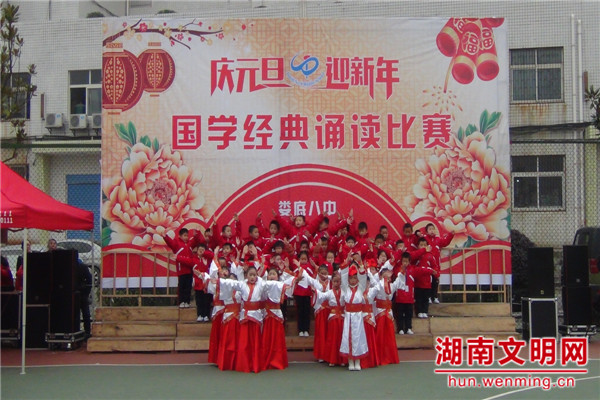 湖南文明网1月1日讯(通讯员 贺旭鹏)12月30日,娄底八中在学校操场举行“迎新年”国学经典诵读比赛,全校42个班2500余名中小学生参加了此次活动。