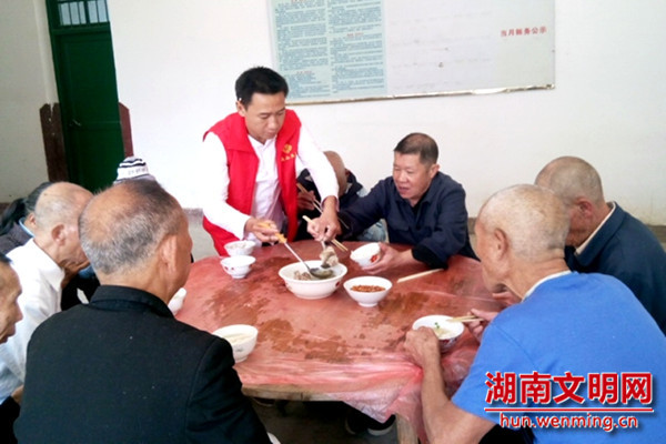 湖南文明网10月22日讯(通讯员 杨雄春 赵彬 牛羊群)10月21日九九重阳节,吃着热腾腾的水饺,住在蓝山县大麻敬老院的所城镇岩口村失独老人邝正田高兴地说:“今天重阳节有这么多爱心志愿者陪我们过节,还有饺子吃,很开心,辛苦你们了……”