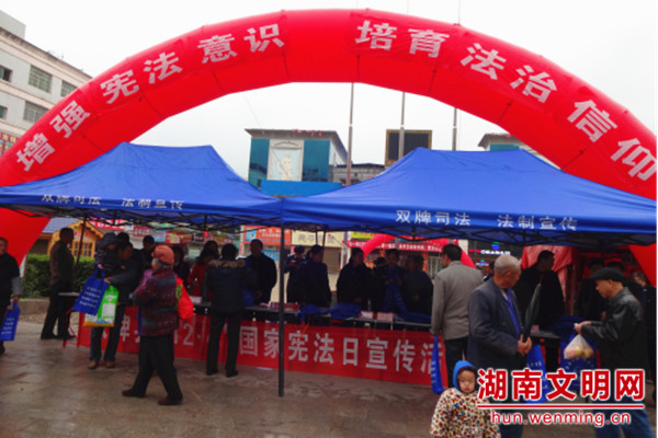湖南文明网12月8日讯(通讯员 卢顺林) 为开展好“12.4”第二个国家宪法日系列宣传活动,大力弘扬宪法精神,坚决维护宪法权威。12月4日上午,由永州市双牌县司法局、县委法治办、县人大内司委、县总工会、县妇联、顺胜律师事务所、峦山法律服务所等10余个单位,在双牌县manbetx安卓手机 广场联合开展以宪法为核心的系列法治宣传活动。