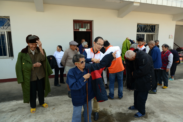 10月11日,岳阳县微水爱心志愿者协会十余名志愿者来到筻口镇敬老院,将60多件棉衣送到老人们手中,提前祝他们重阳节快乐。