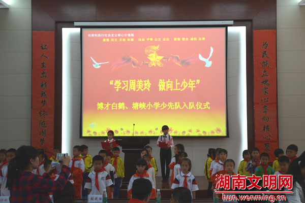 活动现场,举行了少先队新队员入队仪式。在嘹亮的中国少年先锋队队歌中,博才白鹤小学和塘峡小学50名新队员光荣地加入了少先队,老队员为新少先队员佩戴了鲜艳的红领巾。随后,新队员代表发表感言,倡议向见义勇为小英雄周美玲学习,激励少先队员们发扬无私奉献精神,努力完善自我,向善向上,服务他人、服务社会,回报祖国。