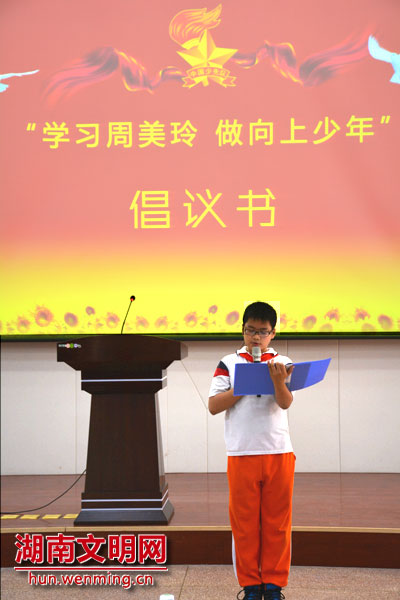 两校联合组织孩子们以独特的方式共庆第66个建队节,并发出倡议号召学习小英雄周美玲,争做向上好少年。长沙市文明办副主任杨立平,团市委副书记黄军其,市教育局党委委员、机关党委书记胡慎信,以及区街相关部门领导和两校数百名师生参加了此次活动。