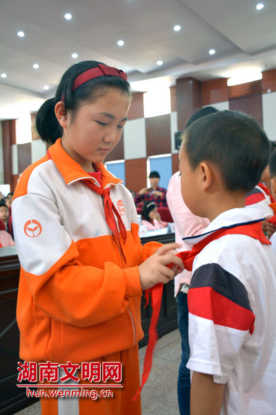 老队员为新少先队员佩戴了鲜艳的红领巾