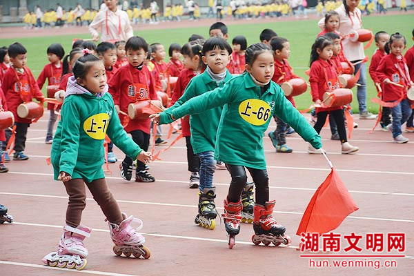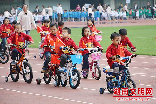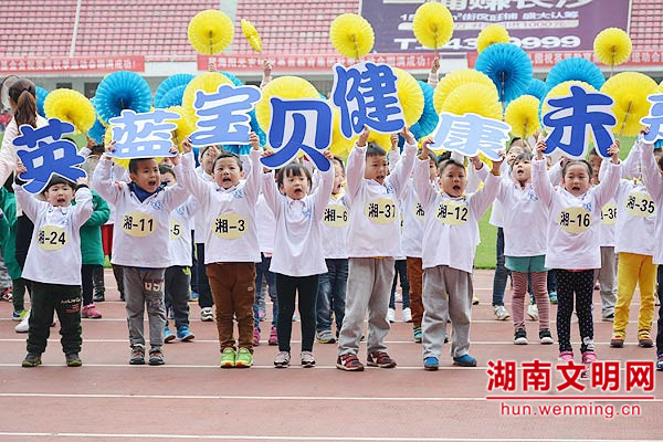 这次秋季亲子运动会共有60多个项目,孩子家长共同参与。在贺龙体育中心的跑道上,10多所幼儿园的小朋友方队和家长方队进行了气氛热烈的入场式。孩子们呼喊着整齐的口号,迈着矫健的步伐,俨然一副运动健将的架势。