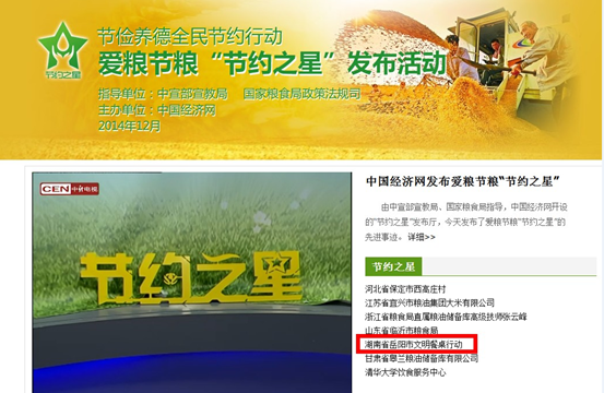 2014年12月22日,由中宣部宣教局、国家粮食局指导,中国经济网开设的“节约之星”发布了爱粮节粮“节约之星”的先进事迹,岳阳文明餐桌行动获得爱粮节粮“节约之星”荣誉称号。