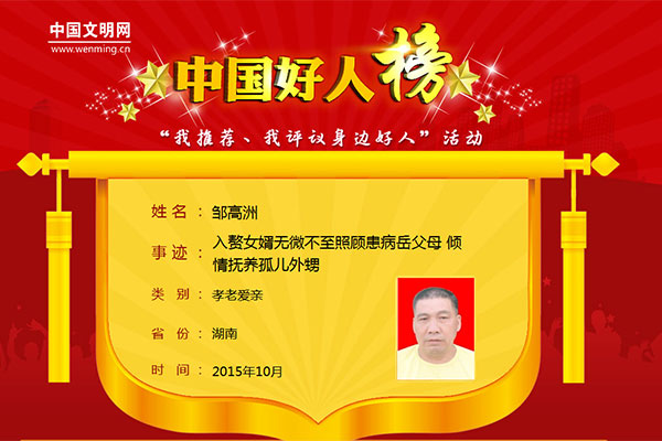 当选为“孝老爱亲好人”的邹高洲,是常德澧县张公庙镇护国村农民。1988年因家庭贫困入赘到张公庙镇护国村5组赵玉兰家。20年来,他倾情抚养孤儿外甥,对患病的岳父母不离不弃。